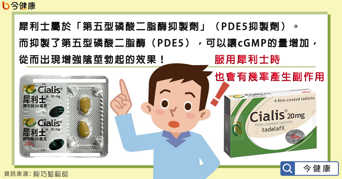 - 按需服用:劑量為10mg或20mg,於性活動前30分鐘服用,效果可持續36小時,適合偶發性使用。