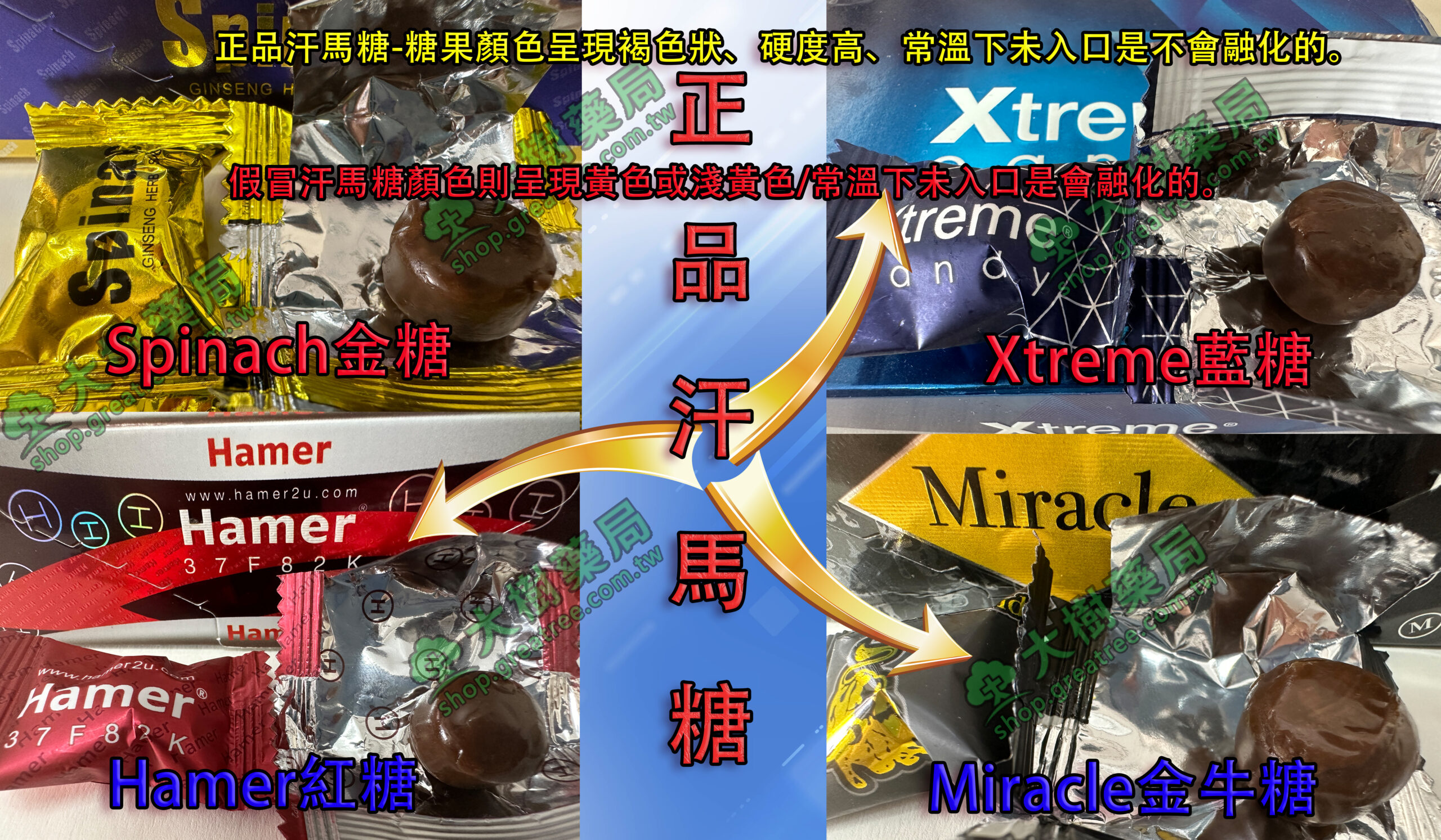 另外,很多人都誤以為汗馬糖是灰色,其實這是錯誤的。正品汗馬糖不管是Hamer紅糖、Xtreme藍糖、Spinach金糖、Miracle金牛糖、Mentalk黑糖的顏色都應該為褐色才對。