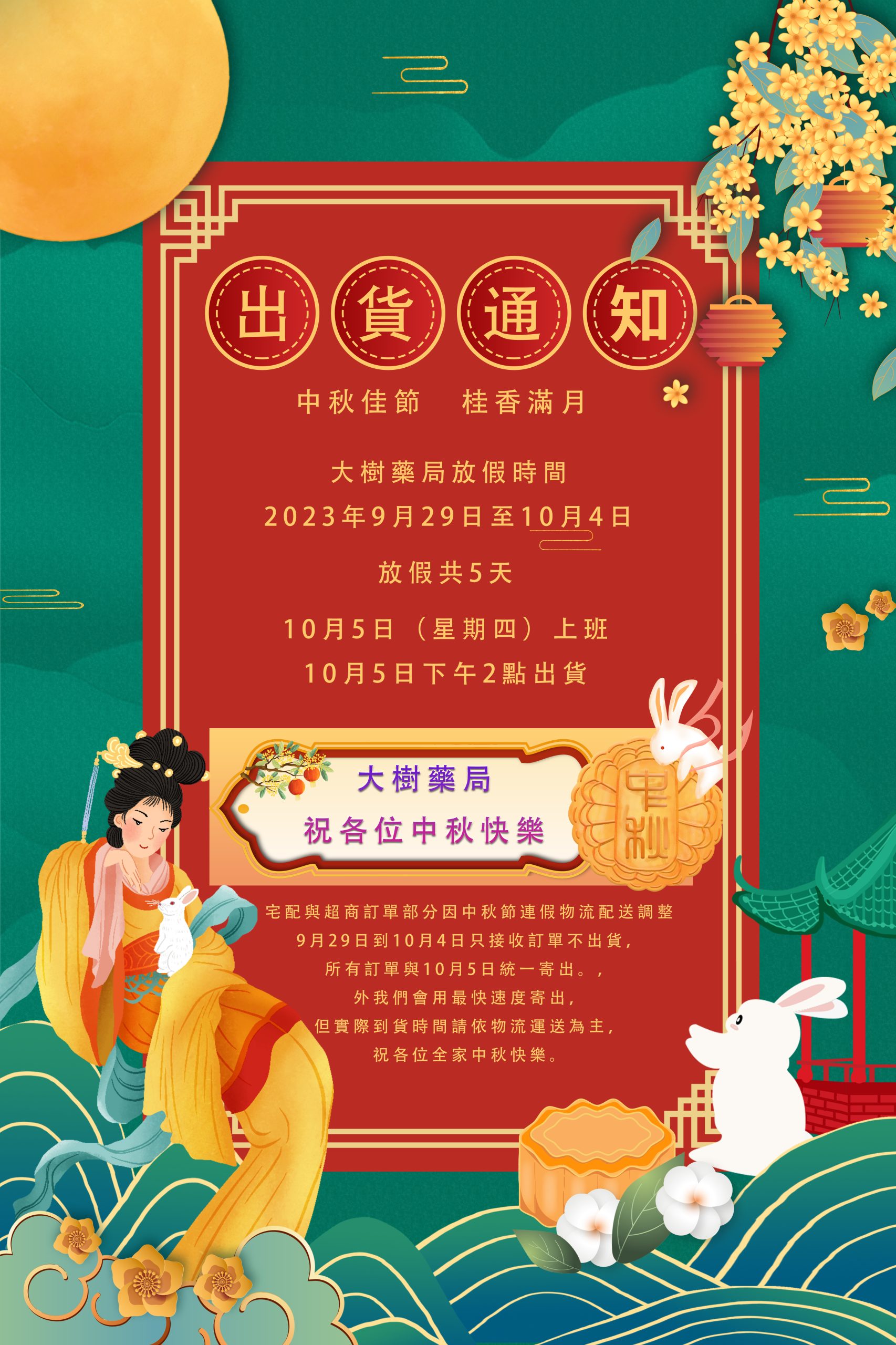 感謝您一直以來對我們大樹藥局的信賴與厚愛。為了更好地為您提供更優質的服務,我們決定中秋佳節對營業時間與藥物配送時間進行調整。