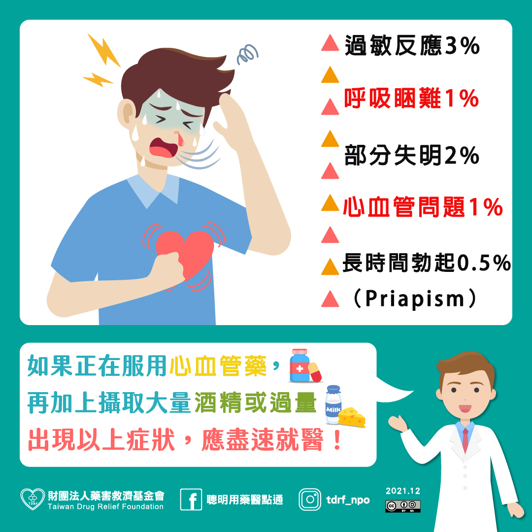 | 心悸胸悶 | 0.5% | 心血管疾病潛在患者 | 舌下含服硝化甘油(⚠️嚴禁與威而鋼併用) |
